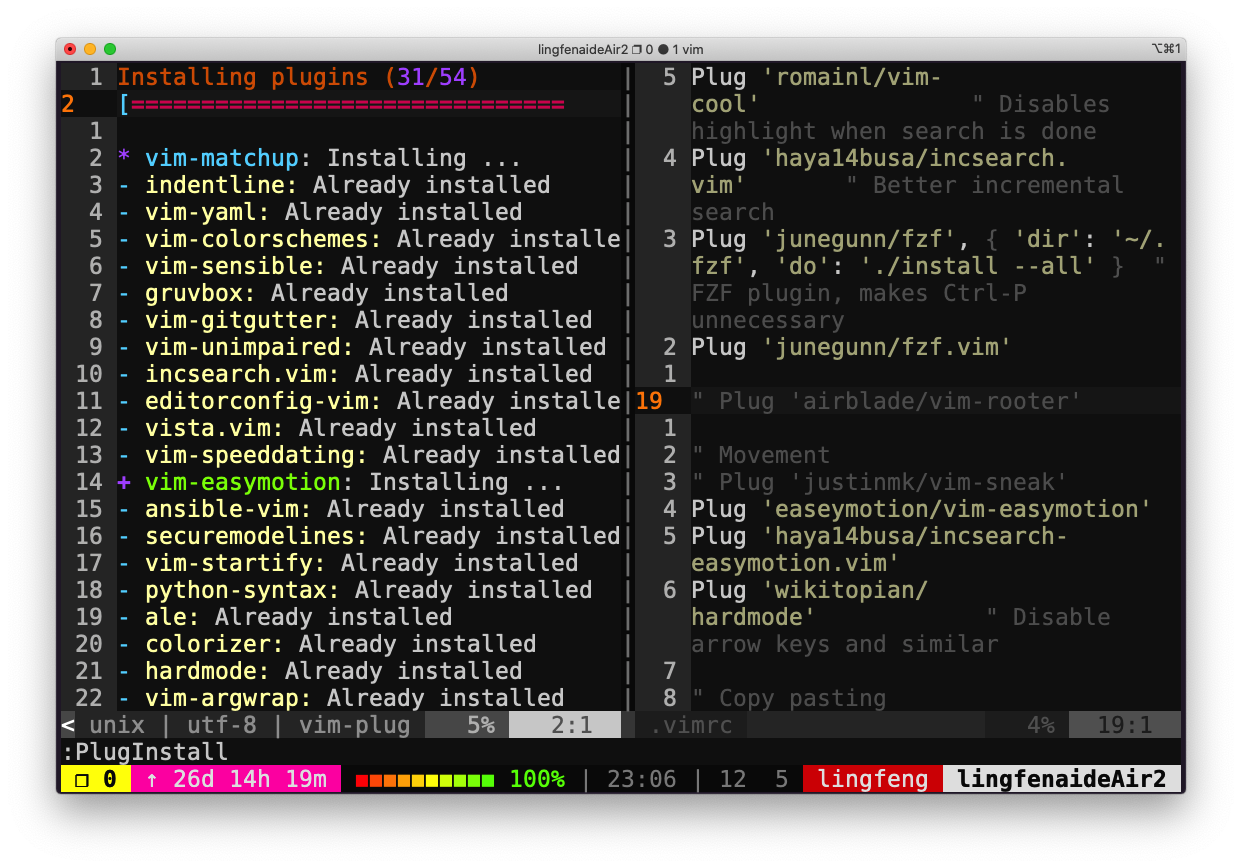 ~/.vimrc和安装更多插件。(在本人虚拟机的 Ubuntu 系统没有找到.vimrc文件,这里直接挪用官方答案)安装插件最简单的方法是使用 Vim 的包管理器,即使用 vim-plug 安装插件: